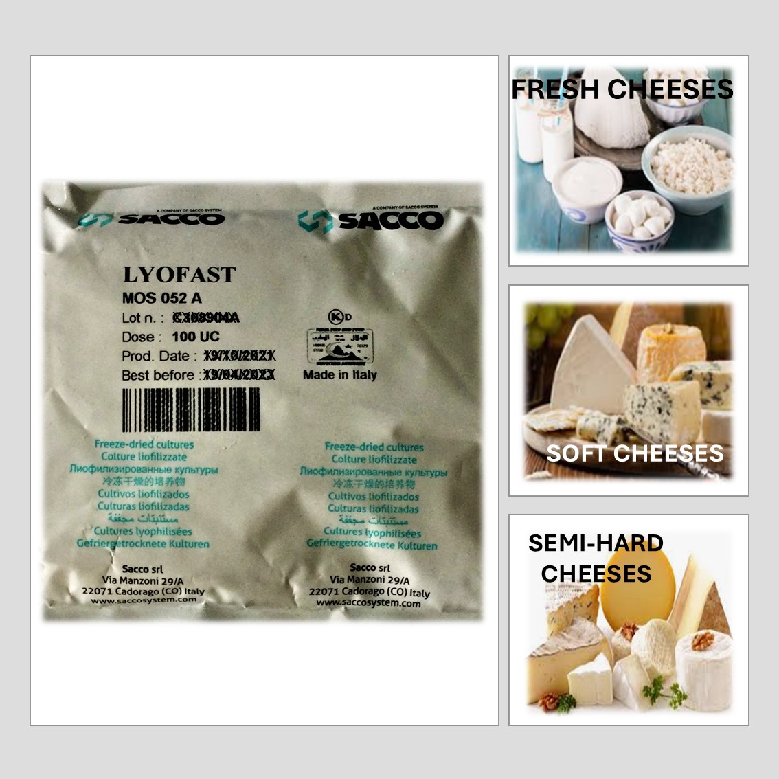 FREEZE-DRIED CONCENTRATED STARTER CULTURES FOR DIRECT VAT INOCULATION OF MILK AND MILK BASES. MESOPHILIC STARTER CULTURE. CONSISTS OF SPECIFICALLY SELECTIVE STRAINS LACTOCOCCUS LACTIS SSP. LACTIS, STREPTOCOCCUS THERMOPHILUS AND LACTOCOCCUS LACTIS SPP. CREMORIS. MOS 052 A CULTURE RANGE CAN BE USED FOR CHEDDAR, FETA, MILD COTTAGE CHEESE, MILD GOUDA CHEESE, SOFT CHEESE, FRESH CHEESE, CAMEMBERT AND ROQUEFORT. DOESN'T PRODUCE GAS AND IS SLIGHTLY SLOWER IN FERMENTATION.