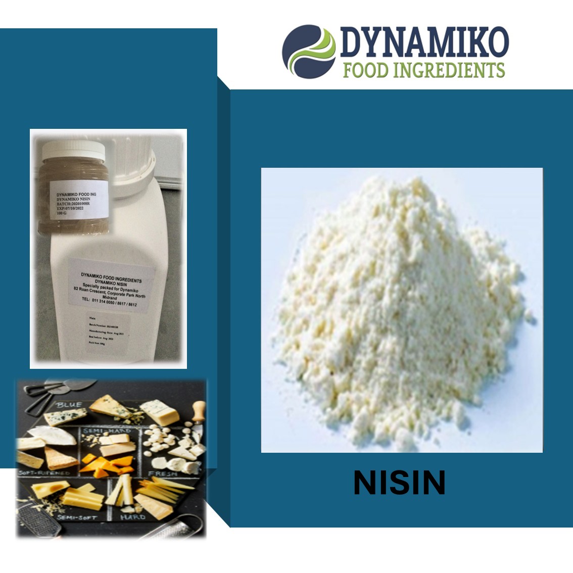 NISIN IS WHITE TO CREAMY/OFF-WHITE POWDER. NISIN IS A NATURAL BACTERIOCIDE OBTAINED FROM THE BACTERIUM STREPTOCOCCUS LACTIS. IT'S APPROVED FOR USE IN E.G. CHEESE, DAIRY PRODUCTS, SAUCES, TINNED FOODS, ETC. PARTICULARLY EFFECTIVE AGAINST DANGEROUS, GRAM-POSITIVE BACTERIA SUCH AS LISTERIA, CLOSTRIDIUM (BOTULISM), ENTEROCOCCUS, B.CEREUS, ETC. IT IS STANDARDISED ON A SODIUM CHLORIDE (SALT) BASE AND IT IS CONSIDERED GRAS (GENERALLY REGARDED AS SAFE) BY THE FDA. APPROVED FOR THE US BY EU, FAO/WHO/JECFA ETC. INHIBITS YEAST AND MOULDS, AS WELL AS MOST BACTERIA. USED TO CLEAN DANGEROUS BACTERIA IN MANY CASES. NO LISTED ALLERGENS PRESENT.