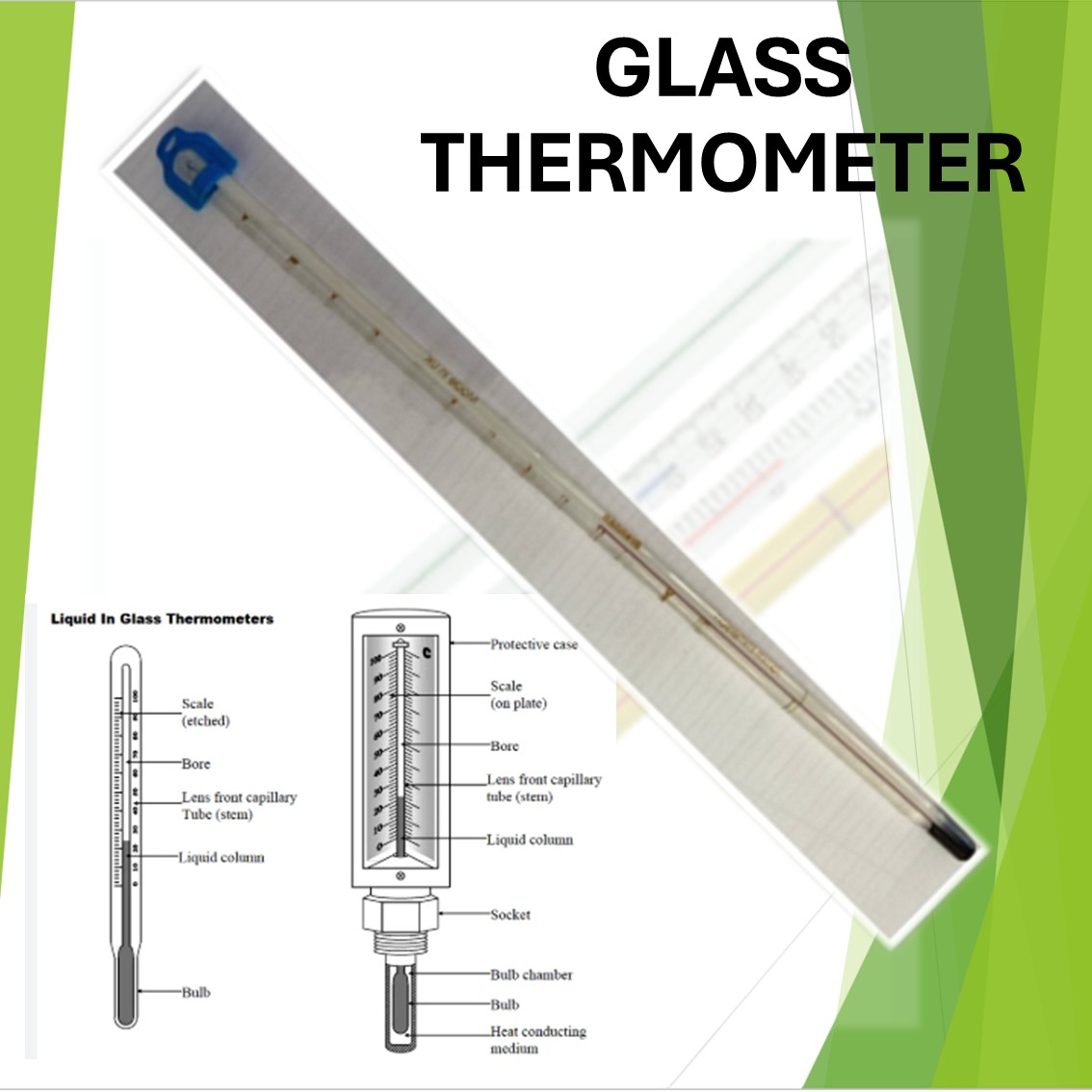 THERMOMETER HAS A LIQUID (USUALLY MERCURY OR ALCOHOL) COLUMN USED TO MEASURE TEMPERATURES. THE TUBE IS CALIBRATED WITH A TEMPERATURE SCALE (-10 TO 110 ºC), ALLOWING YOU TO READ THE TEMPERATURE BASED ON THE HEIGHT OF THE LIQUID COLUMN.