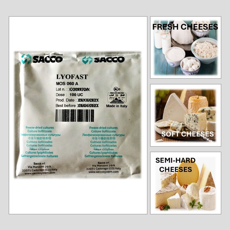 FREEZE-DRIED CONCENTRATED STARTER CULTURES FOR DIRECT VAT INOCULATION OF MILK AND MILK BASES. MESOPHILIC STARTER CULTURE. CONSISTS OF SPECIFICALLY SELECTIVE STRAINS LACTOCOCCUS LACTIS SSP. LACTIS, STREPTOCOCCUS THERMOPHILUS AND LACTOCOCCUS LACTIS SPP. CREMORIS. MOS 060 A CULTURE RANGE CAN BE USED FOR CHEDDAR, FETA, MILD COTTAGE CHEESE, MILD GOUDA CHEESE, SOFT CHEESE, FRESH CHEESE, CAMEMBERT AND ROQUEFORT.