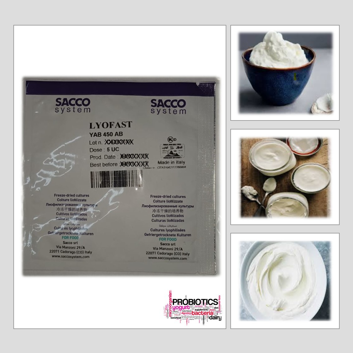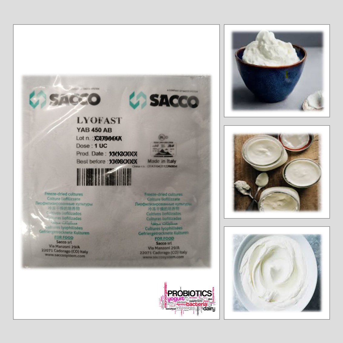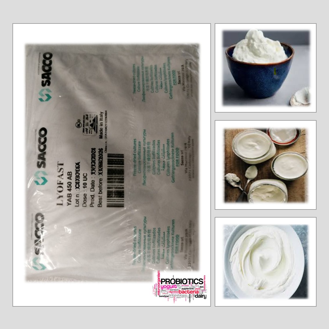YAB 450 AB CONSISTS OF SPECIFICALLLY SELECTED STRAINS OF STREPTOCOCCUS THERMOPHILUS PRODUCING EPS, LACTOBACILLUS DELBRUECKII SSP. BULGARICUS ADDED THE PROBIOTIC STRAINS LACTOBACILLUS ACIDOPHILUS AND BIFIDOBACTERIUM ANIMALIS SSP LACTIS TO ENSURE A UNIFORM AND CONTROLLED PRODUCTION OF YOGHURT.