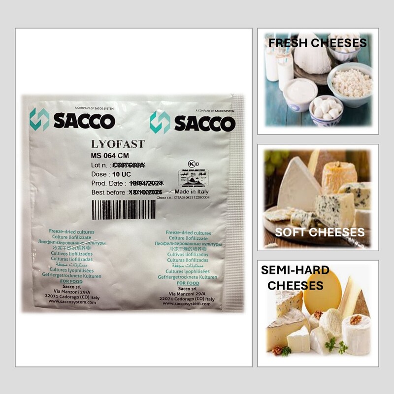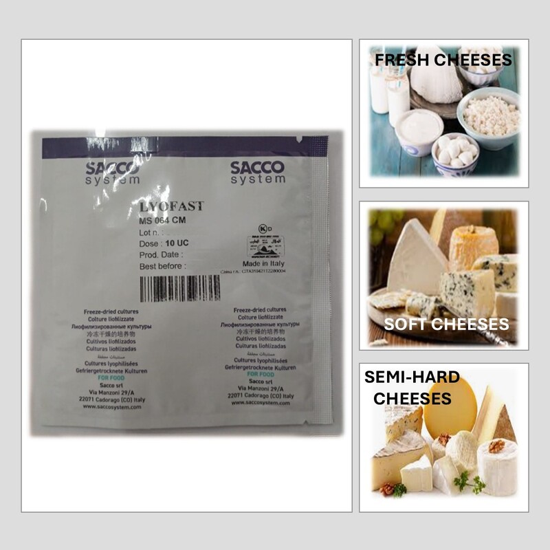 LYOFAST MS 064 CM (A STARTER CULTURE) CONSISTS OF SPECIFICALLY SELECTED STRAINS OF LACTOCOCCUS LACTIS SSP. LACTIS; STREPTOCOCCUS THERMOPHILUS; LACTOCOCCUS LACTIS SSP. LACTIS BIOVAR DIACETYLACTIS. IT HAS A SLOW CITRATE FERMENTATION AND PRODUCE FLAVOUR AND CO2. IT ENSURES A UNIFORM AND CONTROLLED PRODUCTION OF FRESH CHEESE, SOFT CHEESE AND SEMI-HARD CHEESE.
