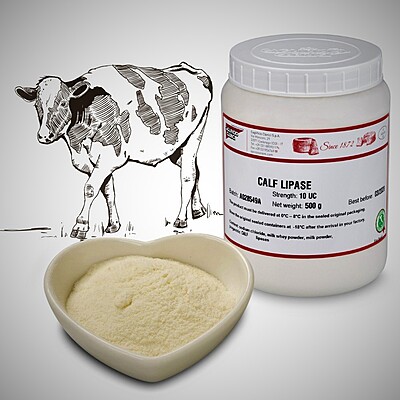 LIPASE (AN ENZYME) IS A LIGHT BEIGE POWDER THAT PLAYS A CRUCIAL ROLE IN THE DIGESTION OF DIETARY FATS (LIPIDS) IN THE HUMAN BODY. MAINLY RESPONSIBLE FOR THE CHARACTERISTIC FLAVOURS OF CERTAIN CHEESES. LIPASE IS AN ENZYME NEEDED TO BREAK DOWN THE BUTTERFAT TO GLYCEROL AND FATTY ACIDS. CALF LIPASE CREATES A DELICATE FLAVOUR WHICH IS A PLEASANT BUTTER SCENT, LIGHTLY SPICY.