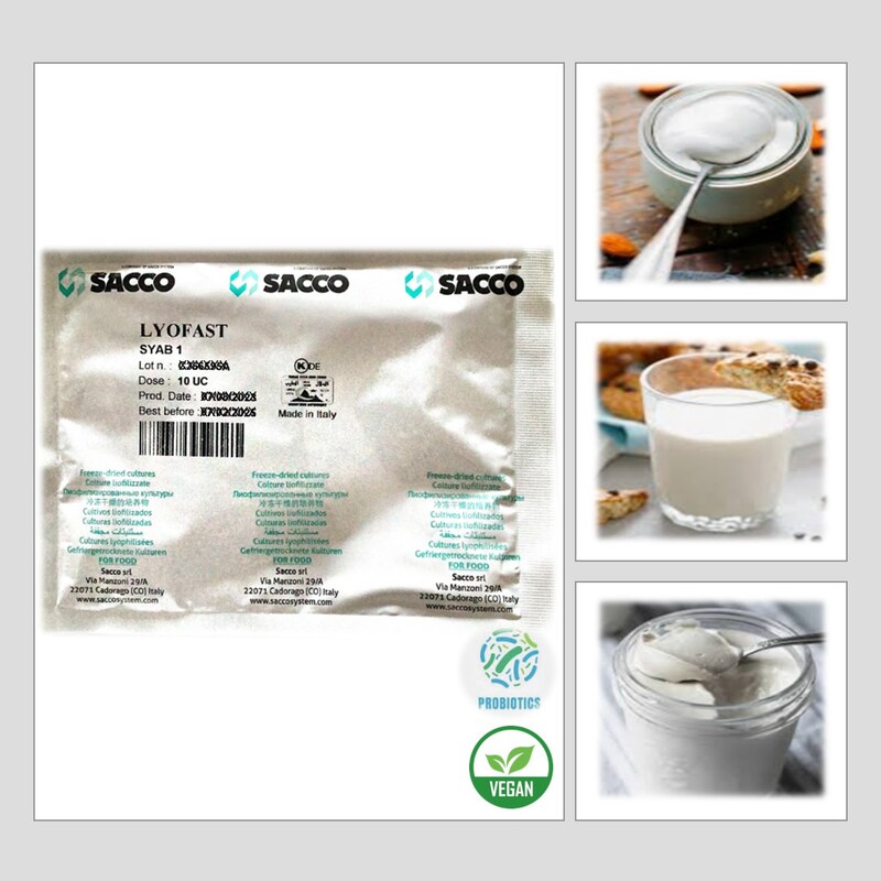 LYOFAST SYAB 1 CONSISTS OF SPECIFICALLY SELECTED STRAINS OF STREPTOCOCCUS THERMOPHILUS DELBRUECKII SSP. BULGARICUS ADDED WITH THE PROBIOTIC STRAINS LACTOBACILLUS ACIDOPHILUS AND BIFDOBACTERIUM ANIMALS SSP LACTIS. THE ENHANCE VISCOSITY IS DUE TO S. THERMOPHILUS PRODUCING EPS. CERTAIN BACTERIA STRAINS CONVERT SUGAR INTO LACTIC ACID, GIVING YOGHURT THAT TANG TASTE AND THICK TEXTURE. ENSURES A UNIFORM AND CONTROLLED PRODUCTION OF TRADITIONAL DRINKABLE, SET AND STIRRED SOY AND COCONUT YOGHURT. THIS PRODUCT IS FREE FROM MILK DERIVATIVES. PROBIOTIC CULTURES ARE BENEFICIAL FOR GUT HEALTH BY HELPING TO ALLEVIATE DIGESTIVE ISSES, CAN IMPROVE THE IMMUNE SYSTEM AND HAS POTENTIAL MENTAL HEALTH BENEFITS.