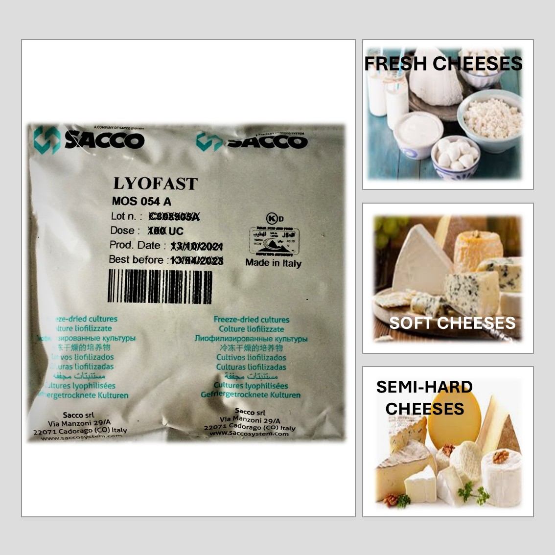 FREEZE-DRIED CONCENTRATED STARTER CULTURES FOR DIRECT VAT INOCULATION OF MILK AND MILK BASES. MESOPHILIC STARTER CULTURE. CONSISTS OF SPECIFICALLY SELECTIVE STRAINS LACTOCOCCUS LACTIS SSP. LACTIS, STREPTOCOCCUS THERMOPHILUS AND LACTOCOCCUS LACTIS SPP. CREMORIS. MOS 054 A CULTURE RANGE CAN BE USED FOR CHEDDAR, FETA, MILD COTTAGE CHEESE, MILD GOUDA CHEESE, SOFT CHEESE, FRESH CHEESE, CAMEMBERT AND ROQUEFORT. DOESN'T PRODUCE GAS AND IS SLIGHTLY SLOWER IN FERMENTATION.